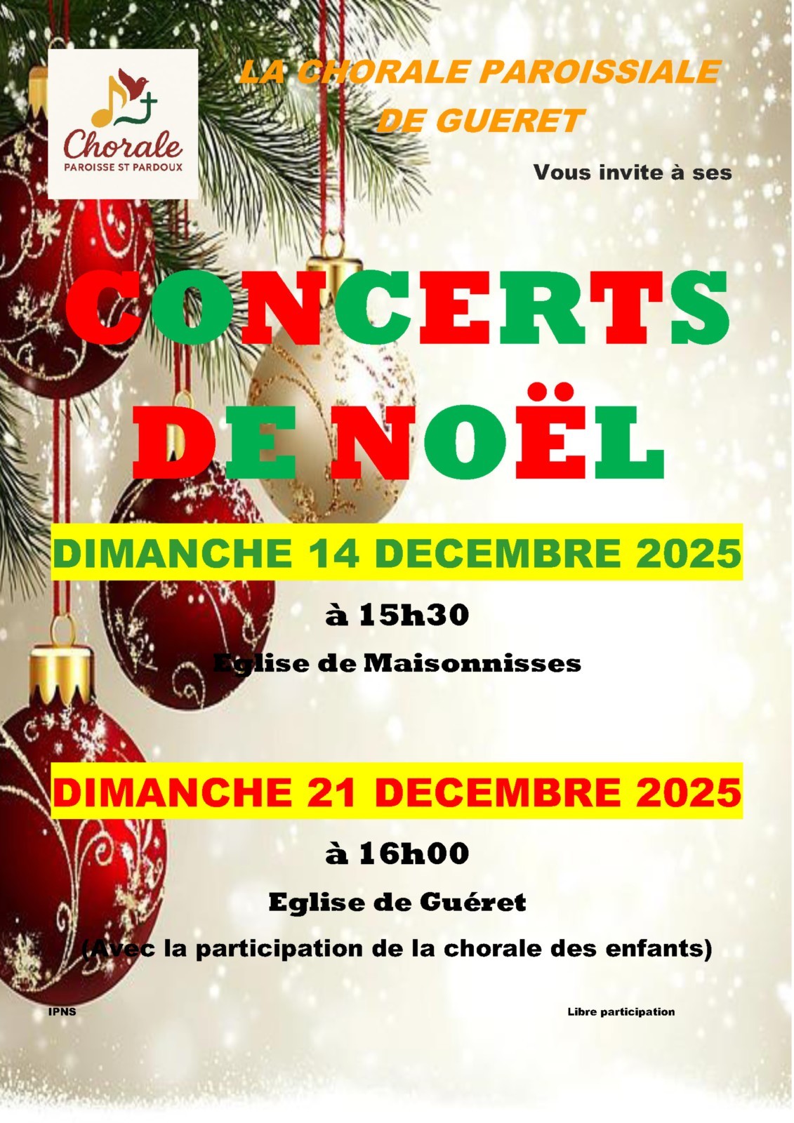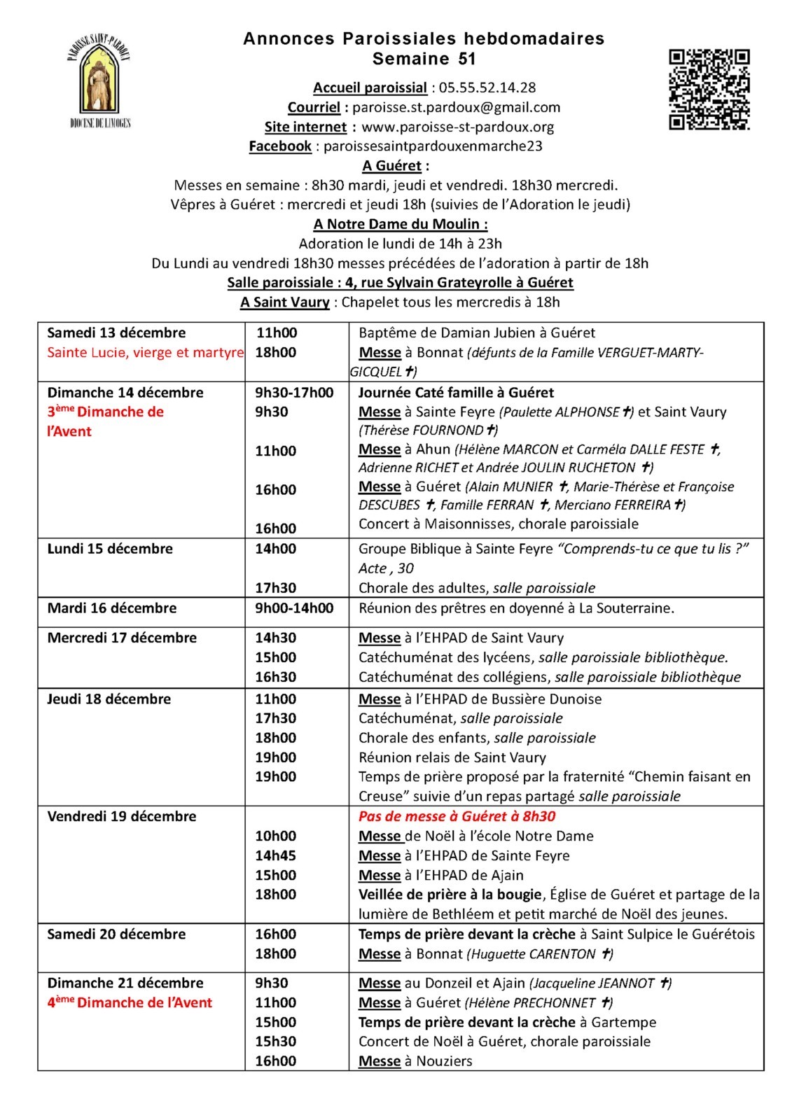 - Dimanche 21 décembre : 9 h 30 Ajain, Le Donzeil (qui REMPLACE celle de Maisonnisses, annulée en raison du marché de Noël), 11 h Guéret, 18 h Nouziers
