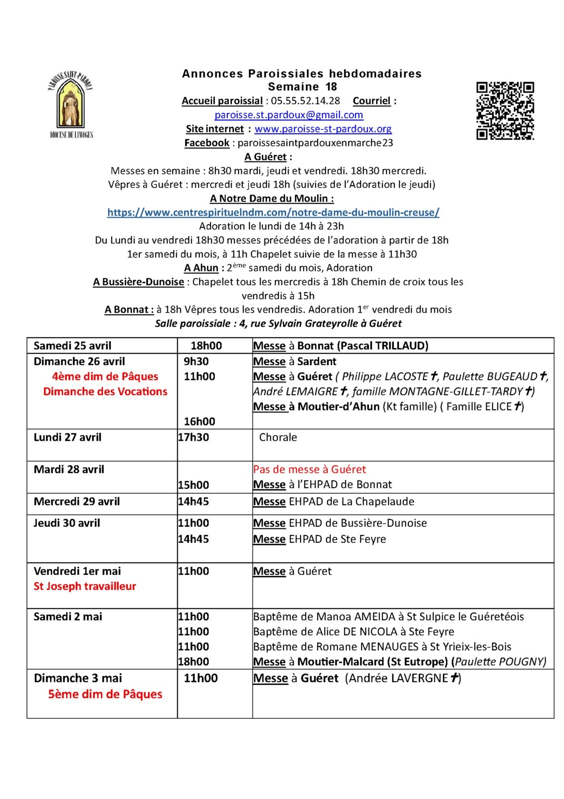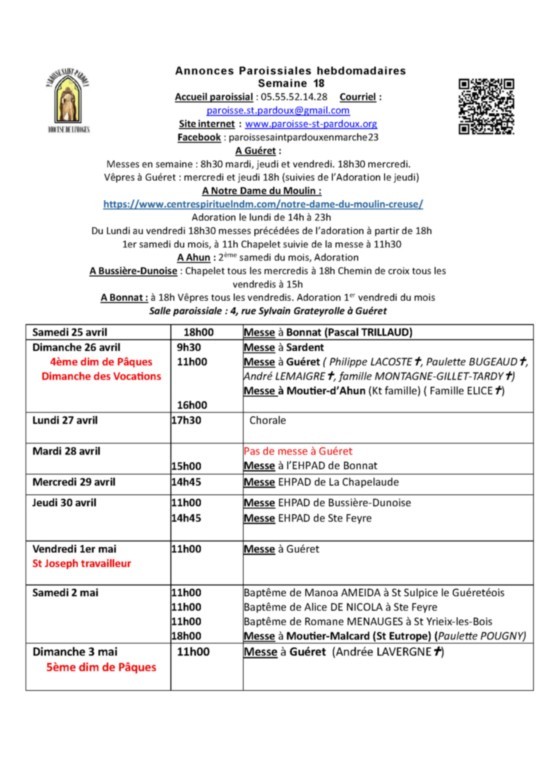 - Jeudi 14 mai Ascension : 9h30 Ste Feyre et St Vaury ; 11h00 Guéret et Ahun