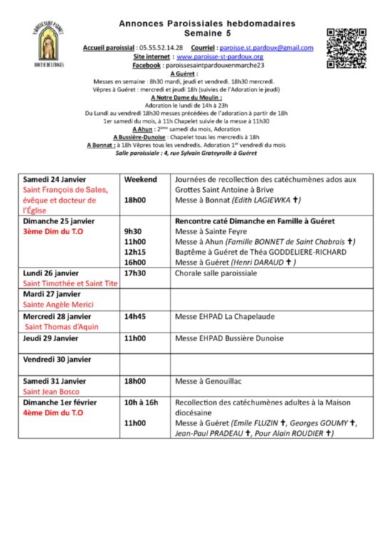 - Dimanche 1er février : une seule messe à 11h à Guéret (les messes à Sardent et Bussière-Dunoise sont supprimées)