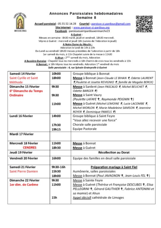 - Mercredi 18 Février Cendres : 11h00 Bonnat, 18h30 Guéret