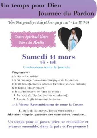 - Samedi 14 mars : Journée du Pardon à Notre Dame du Moulin : Moutier d’Ahun