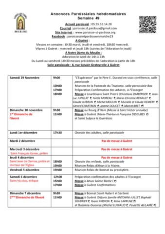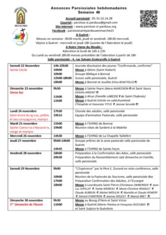 - Samedi 6 décembre : 15 h Ahun (fête de Sainte Barbe), 17 h Guéret (confirmations)