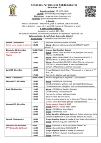 - Dimanche 21 décembre : 9 h 30 Ajain, Le Donzeil (qui REMPLACE celle de Maisonnisses, annulée en raison du marché de Noël), 11 h Guéret, 18 h Nouziers