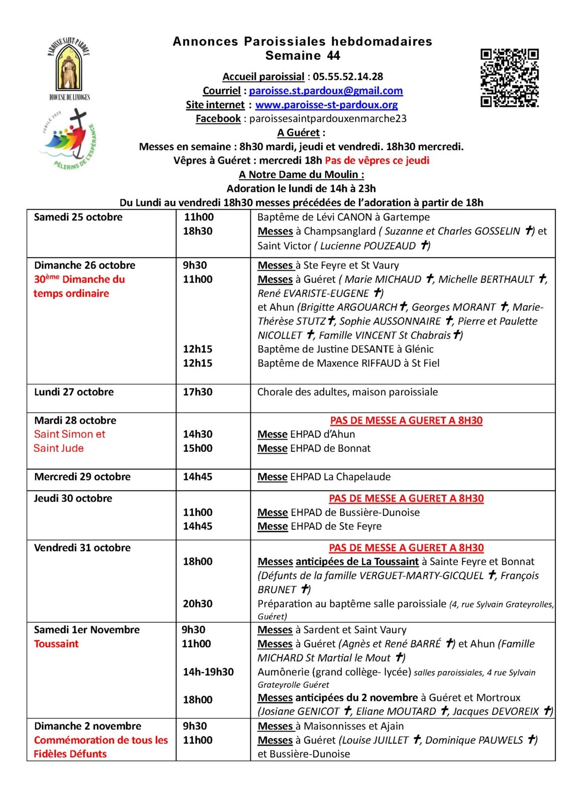 - Samedi 1er novembre (Messes anticipées du jour des défunts) : 18 h Guéret, Mortroux