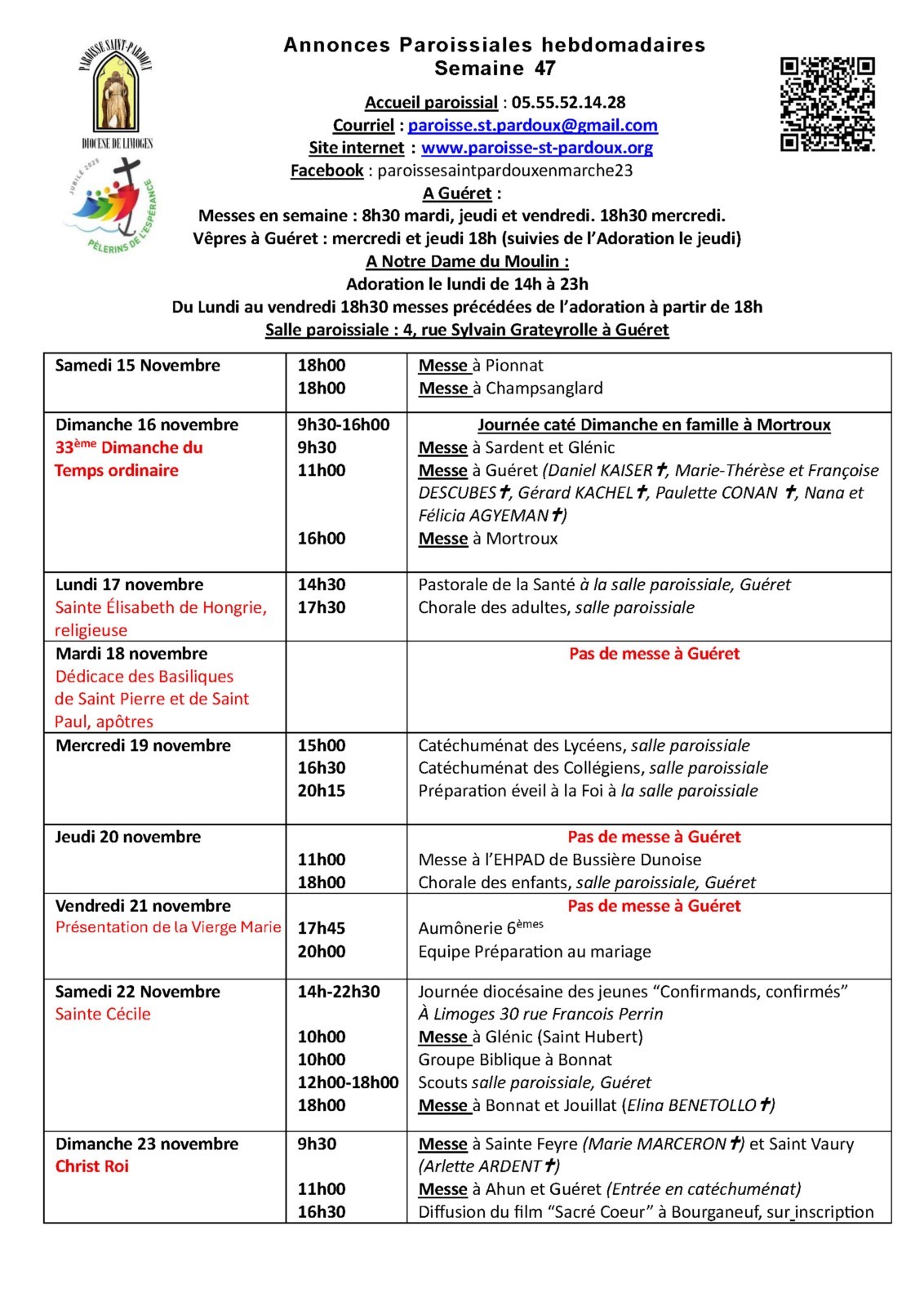 - Dimanche 23 novembre : 9 h 30 Sainte-Feyre, Saint-Vaury, 11 h Ahun, Guéret